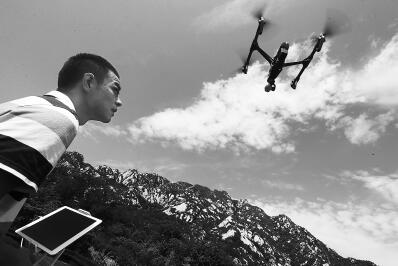 昨天在凤凰岭,海淀林业站的工作人员使用无人机对山区林地进行巡护。记者 饶强摄