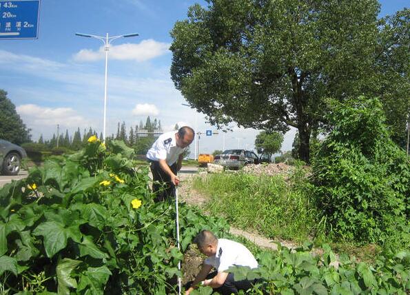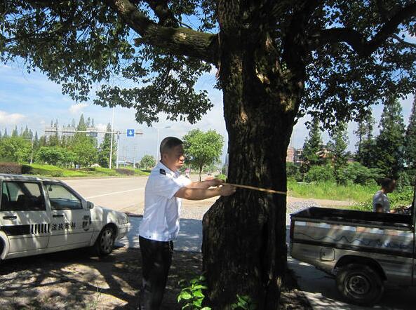 7月6日,笔者路过永康市方岩大道金江龙村地段时,看到两位木检站的执法人员正在给一株胸佩编号为0722200080,树龄为310年的浙江省古树名木保护牌的樟树进行“体检”。