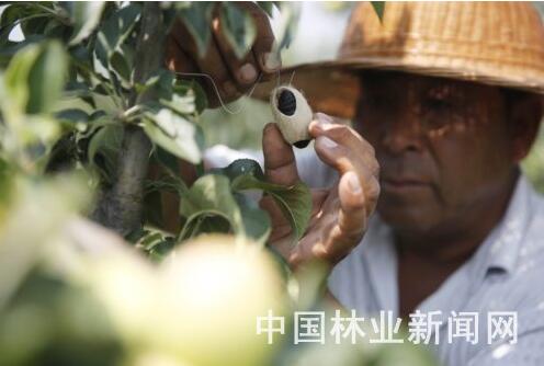 6月28日,河南省宝丰县林业部门组织森防员把2000枚周氏啮小蜂蛹悬挂在肖旗乡派铌迩农业生态果园的树枝上,防治林木病虫害。